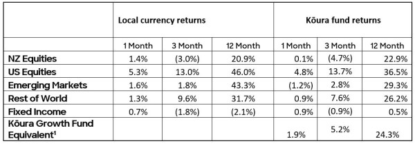 [1] Kōura Growth Fund based on a typical 80:20 mix, NZ Equities 20%, US Equities 35.4% Emerging Markets 8.4%, Rest of World Equities 16.2%, Fixed Income 20%