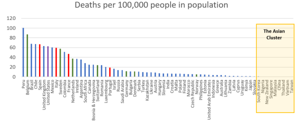 - East Asian countries have had significantly better health outcomes than other countries, largely as a result of mobilising quickly with strong testing and contact tracing infrastructure in place. There was infrastructure introduced during the SARS pandemic in 2003 which assisted.