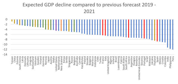 To assess the economic impact we looked at how much lower 2021 GDP is expected to be now compared to at the start of 2020. We used this measure to normalise for where individual countries are in their outbreaks and remove noise that short term Government stimulus might have created in the numbers.