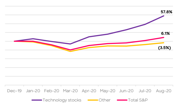 In the US, the market has returned to all-time highs. However, as you can see in the chart below, there are two different courses. An index of technology stocks has delivered a 58% return year to date, whereas the remainder of the S&P500 has a 3.5% loss year to date. New Zealand is similar; once Fisher & Paykel Healthcare and A2 Milk are removed from the index, the remainder is in loss-making territory for the year.
