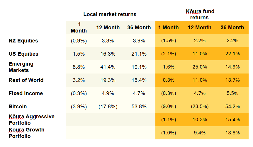 *Source: Factset: Kōura returns are pre-tax and post-fees. Returns over 12 months are annualised. Local market returns use the relevant markets indices; NZ Equities uses NZX50 index; US Equities uses S&P500 index; Rest of World uses MSCI EAFE Index; Emerging Markets uses MSCI Emerging Markets Index, Fixed Interest uses Bloomberg Aggregate NZ Composite Bond Index. Bitcoin return is the USD change in price of Bitcoin. The return for an Aggressive Portfolio represents the equivalent of 95% growth and 5% income assets investing in core Kōura Funds. The return for a Growth Portfolio represents the equivalent of 80% growth and 20% income assets by investing in core Kōura Funds. Returns are calculated by Kōura. Past performance is not a reliable indicator of future performance. Returns are not guaranteed, and investment values may fluctuate over time.