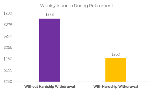 Although it may seem you are only taking out a small portion of your fund (e.g. $10,000) this amount will equate to a much larger amount over your working life. Because invested money earns extra dollars on top (the effect of compounding interest), by withdrawing early, you’re losing this additional revenue stream. This means that if you take out $10,000 at the age of 35, you’ll have $36,000 less1 by the time you retire if it’s not quickly replaced. That’s $18 less per week in retirement.