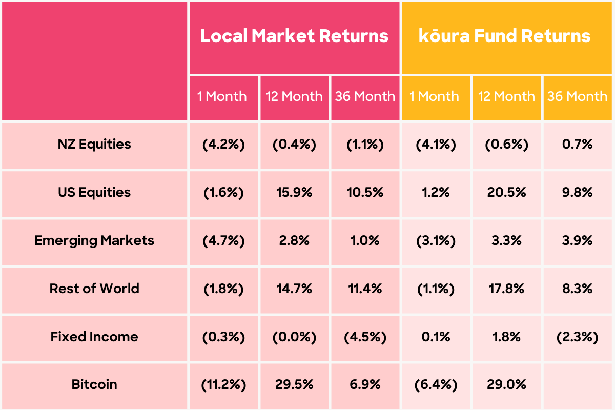 Local market returns use the relevant market indices; NZ Equities uses NZX50 index; US Equities uses S&P500 index; Rest of World uses MSCI EAFE Index; Emerging Markets uses MSCI Emerging Markets Index, Fixed Interest uses Bloomberg Aggregate NZ Composite Bond Index. Bitcoin return is the USD change in price of Bitcoin.