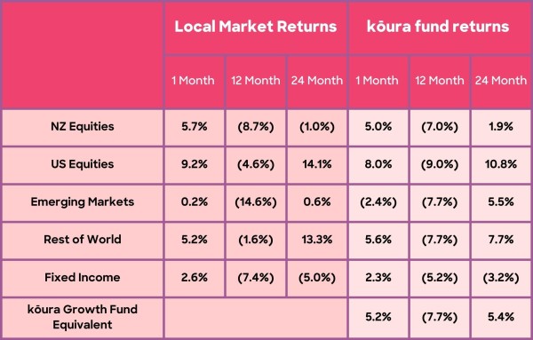 Kōura Growth Fund based on a typical 80:20 mix, NZ Equities 20%, US Equities 36.6%, Emerging Markets 7.8%, Rest of World Equities 15.6%, Fixed Income 20%. The Kōura funds are impacted by currency (translation of local currency indices to NZD) and also differences in constituents between the underlying indices and the actual investments that the Kōura funds invest in. Past performance does not equal future performance.