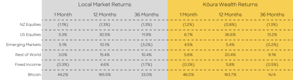 Source: Factset: Kōura returns are pre tax and post fees. Returns over 12 months are annualised. Past performance is not necessarily an indicator of future performance and return periods may differ. Local market returns use the relevant markets indices; NZ Equities uses NZX50 index; US Equities uses S&P500 index; Rest of World uses MSCI EAFE Index; Emerging Markets uses MSCI Emerging Markets Index, Fixed Interest uses Bloomberg Aggregate NZ Composite Bond Index. Bitcoin return is the USD change in price of Bitcoin. Returns to February 29th, 2024.