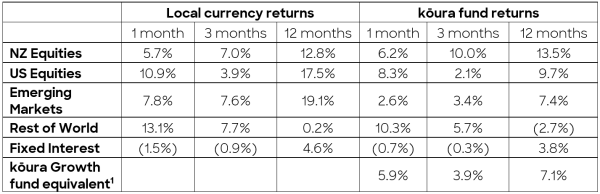 The New Zealand economy continues to go from strength to strength, causing the New Zealand dollar to rise; this reduces returns for New Zealand based investors. The New Zealand dollar appreciated by 6.5%, reducing the returns for New Zealand investors down to 4.8%.