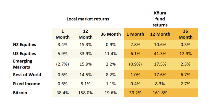 This drove US equity markets and Bitcoin to all-time highs. The S&P registered an impressive 6% gain, and Bitcoin jumped from $70k at the start of the month to finish the month just under $100k. Surprisingly, the European markets delivered gains despite the looming threat of tariffs and what it might do to their economies. For average KiwiSaver members, these strong returns were amplified by the falling NZ dollar.