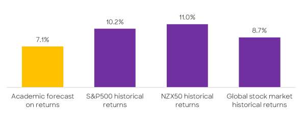 With interest rates at all-time lows, using historical returns is not a great tool to forecast future returns. Academic forecasters break down a return into the interest rate component and the risk component, allowing us to normalise for historical interest rates. Using this metric gives a forecasted return of 7.1%.