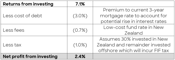 You can now secure a fixed-rate mortgage below 3%, whereas investing could generate a net return (after fees and taxes) of 5-6% over the medium term. This could give you an annual profit of 2-3% per annum - if you invested $100,000, this could give you a profit of $10,000 - 15,000 over a 5 year period.