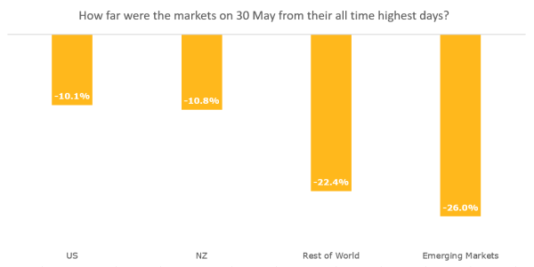 Many may be surprised to see that the US and New Zealand markets are sitting only 10% short of their all-time highs. To understand the apparent mismatch between markets vs the situation we’re seeing on the news, it’s important to understand that these markets have had some very strong performers which have distorted the overall benchmark (Tech in the US; Fisher Paykel Healthcare and A2 Milk in New Zealand). The strong market performance is indicative of investor confidence that the economies can quickly bounce back from the approaching economic downturn, as well as the strength of the Governmental stimulus packages.