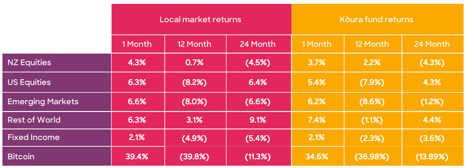 The Kōura funds are impacted by currency (translation of local currency indices to NZD) and also differences in constituents between the underlying indices and the actual investments that the Kōura funds invest in. Kōura returns are net of tax. The Kōura Carbon Neutral Crypto Currency Fund inception date was 23 May 2022. Returns over 12 months are annualised. Past performance is not necessarily an indicator of future performance and return periods may differ.