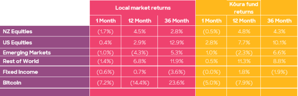 The Kōura funds are impacted by currency (translation of local currency indices to NZD) and also differences in constituents between the underlying indices and the actual investments that the Kōura funds invest in. Kōura returns are net of tax. The Kōura Carbon Neutral Crypto Currency Fund inception date was 23 May 2022. Returns over 12 months are annualised. Past performance is not necessarily an indicator of future performance and return periods may differ.