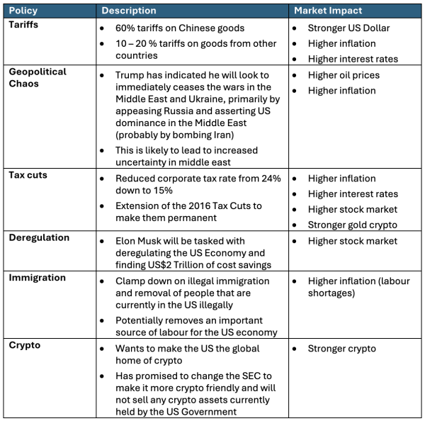 Set out below are some of the Trump policies with their potential market impacts.